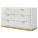 Modern luxury with a minimalist look offers a perfect fit for updated bedrooms as the six-drawer enhances a sleek master suite or guest bedroom. Wood and wood products construct a dresser with clean lines and a stylish Mid-Century Modern vibe. This dresser offers simplicity with sleek elegance, as accents include straight drawer handles and a matching base. Spacious drawers operate smoothly on center drawer glides. Choose this dresser for its versatility and convenience, accompanying either matching or coordinating pieces to pull a statement-making look together.