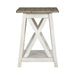 Liberty Furniture Laurel Bluff End Table in Antique White with Dusty Gray Top 810-OT1020. Create your own private getaway with the Laurel Bluff end table. Crafted with excellence using Rubberwood solids, this piece features an Antique White finish with a Dusty Grey top. The X-style trestle base and square block legs leads to the open bottom shelf for extra storage or display items. Create an airy and inviting atmosphere with the Laurel Bluff end table.