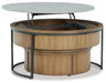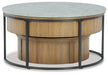• Coffee table with faux cement melamine top; lift-top mechanism