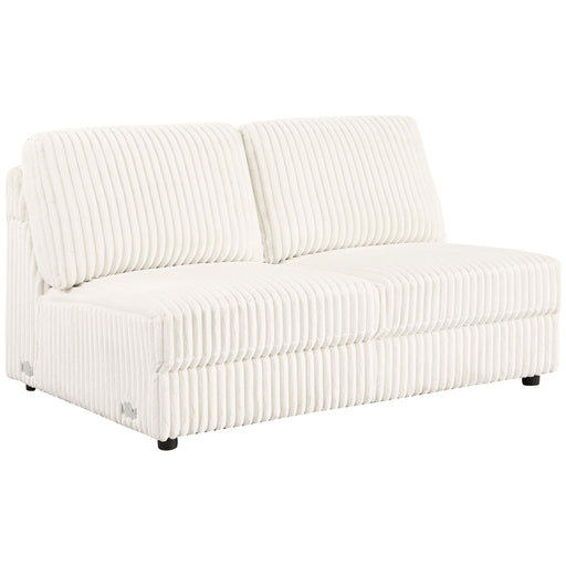 View full detailsAdd versatile seating to your sectional with the armless loveseat, upholstered in ivory wide corduroy. This piece offers plush comfort and easily f...